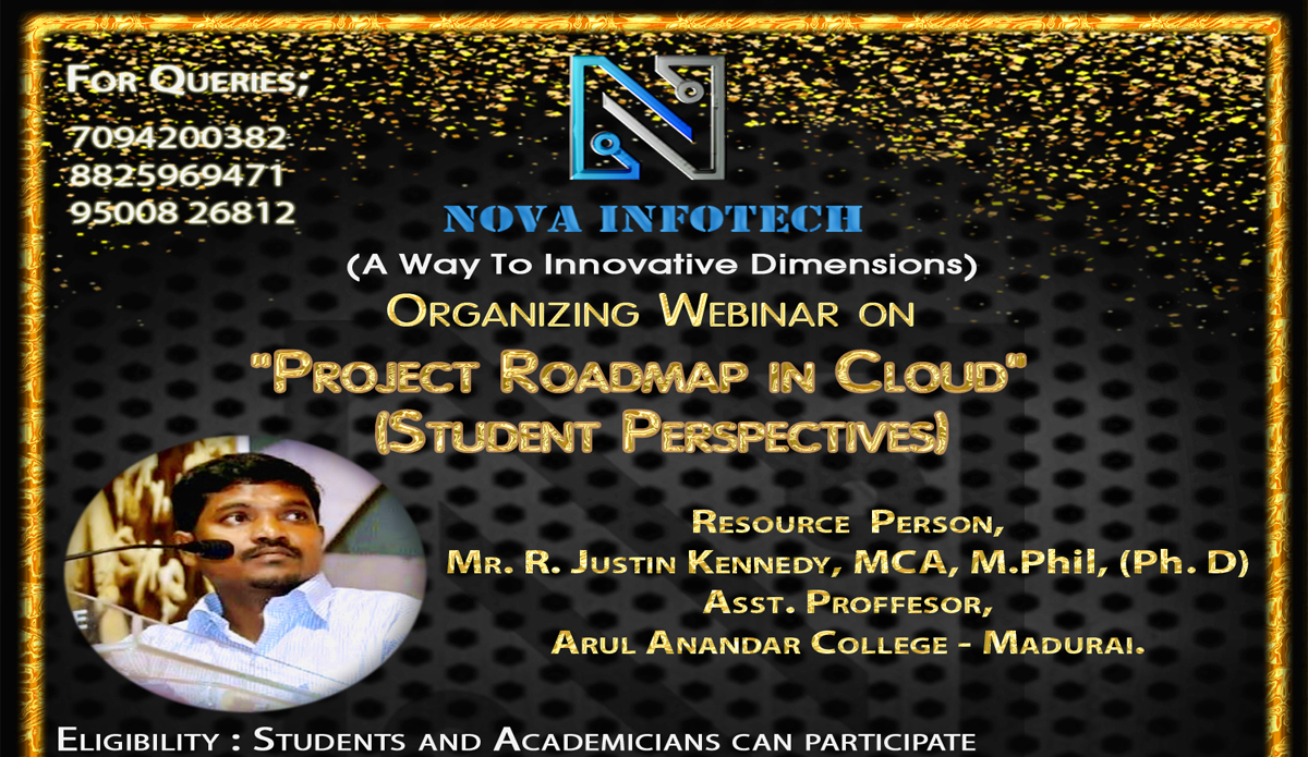 Nova Infotech organised a Webinar on "Project Road map in Cloud" on 12 July, 2020 to enrich the students knowledge in cloud technology. Mr. R. Justin Kennedy, Asst. Professor, Dept. of CS&A, Arul Anandar College was the Resource person who shared his valuable knowledge and his precious experience on Cloud Technology.