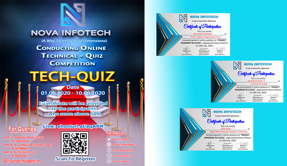 Tech Quiz was an Online Technical Quiz Competition conducted by Nova Infotech from 01 June, 2020 to 15 June, 2020. It was conducted to help the students and the academians to test their knowledge on Computers and Technology.